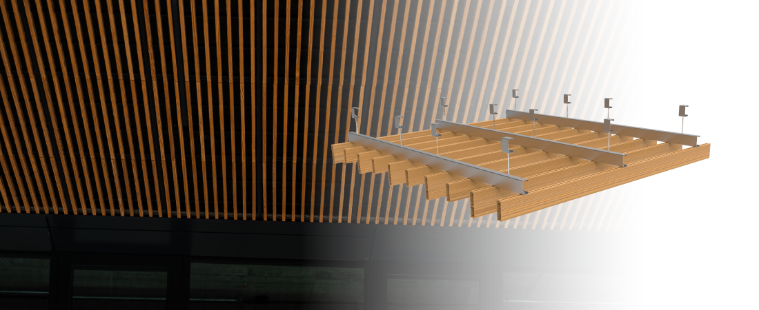- Suspensión con varillas roscadas y bulones que se alojan en el canal del perfil, rematados con tapas de aluminio.